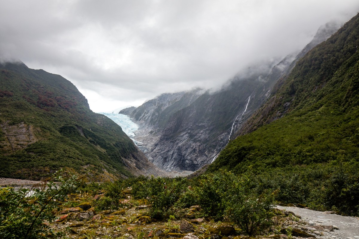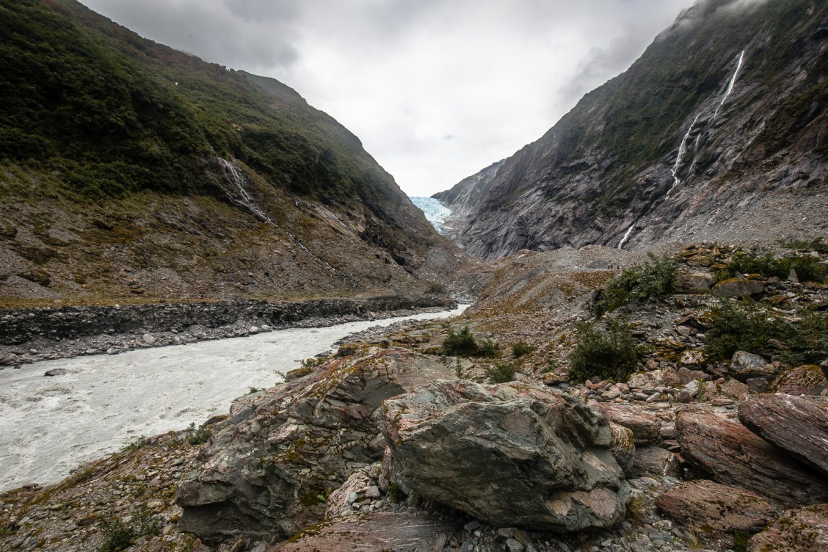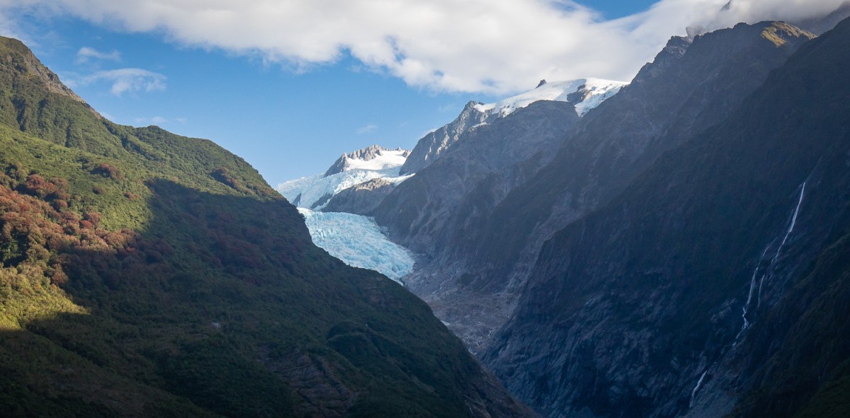 The Franz Josef Glacier is currently 12 km long and terminates 19 km from the ocean. It exhibits a cyclic pattern of advance and retreat, driven by differences between the volume of meltwater at the foot of the glacier and volume of snowfall feeding the top.