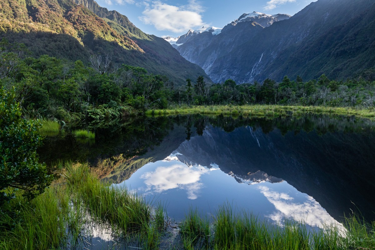 Setting sun on Franz Joesef glacier.The reflecting pool at Franz Josef glacier.