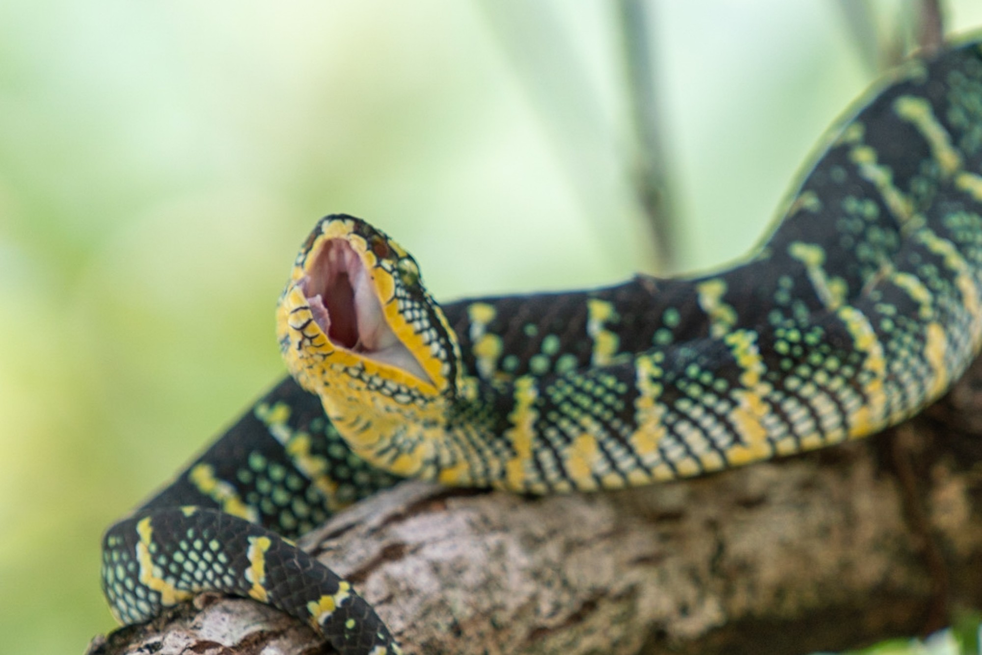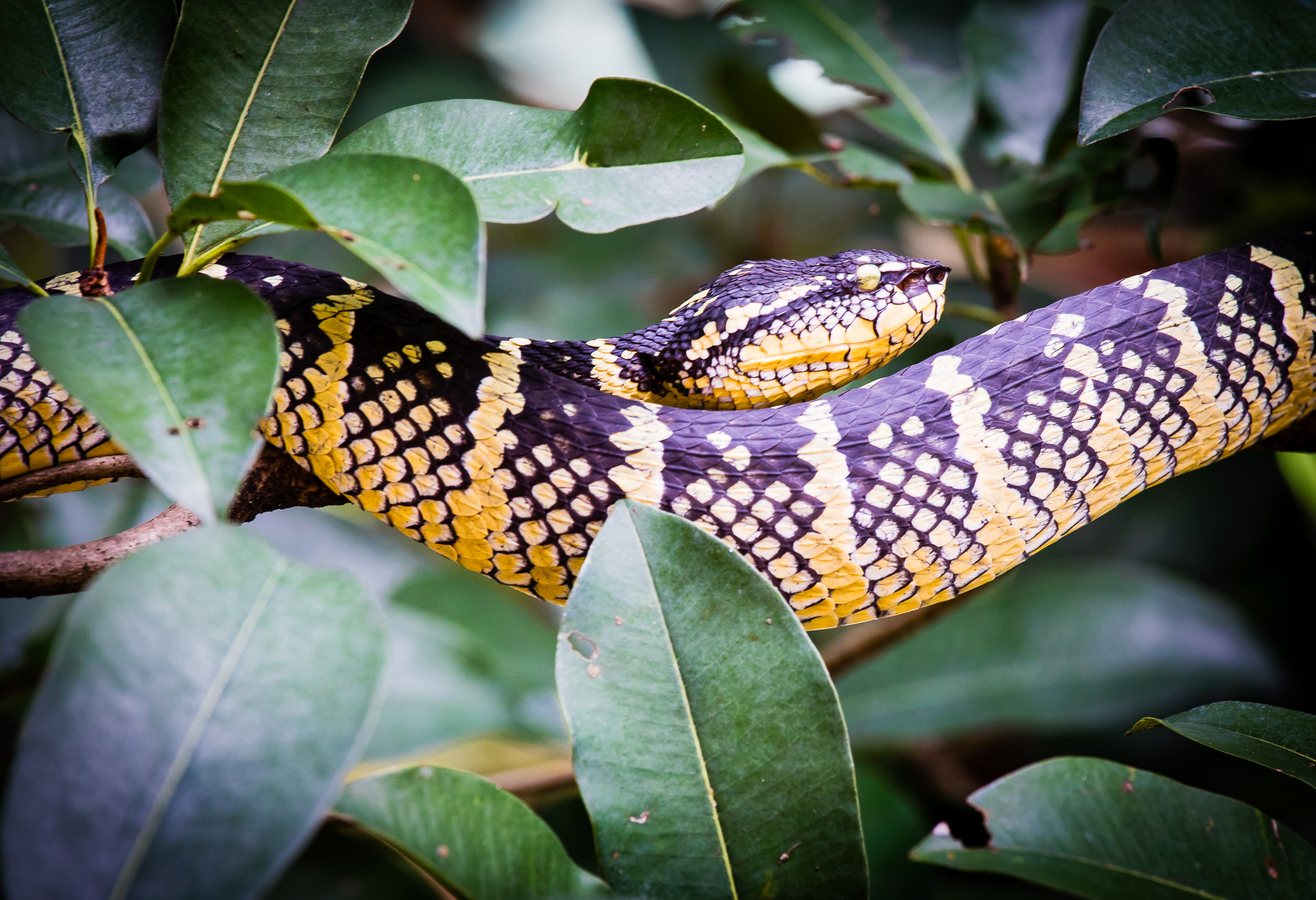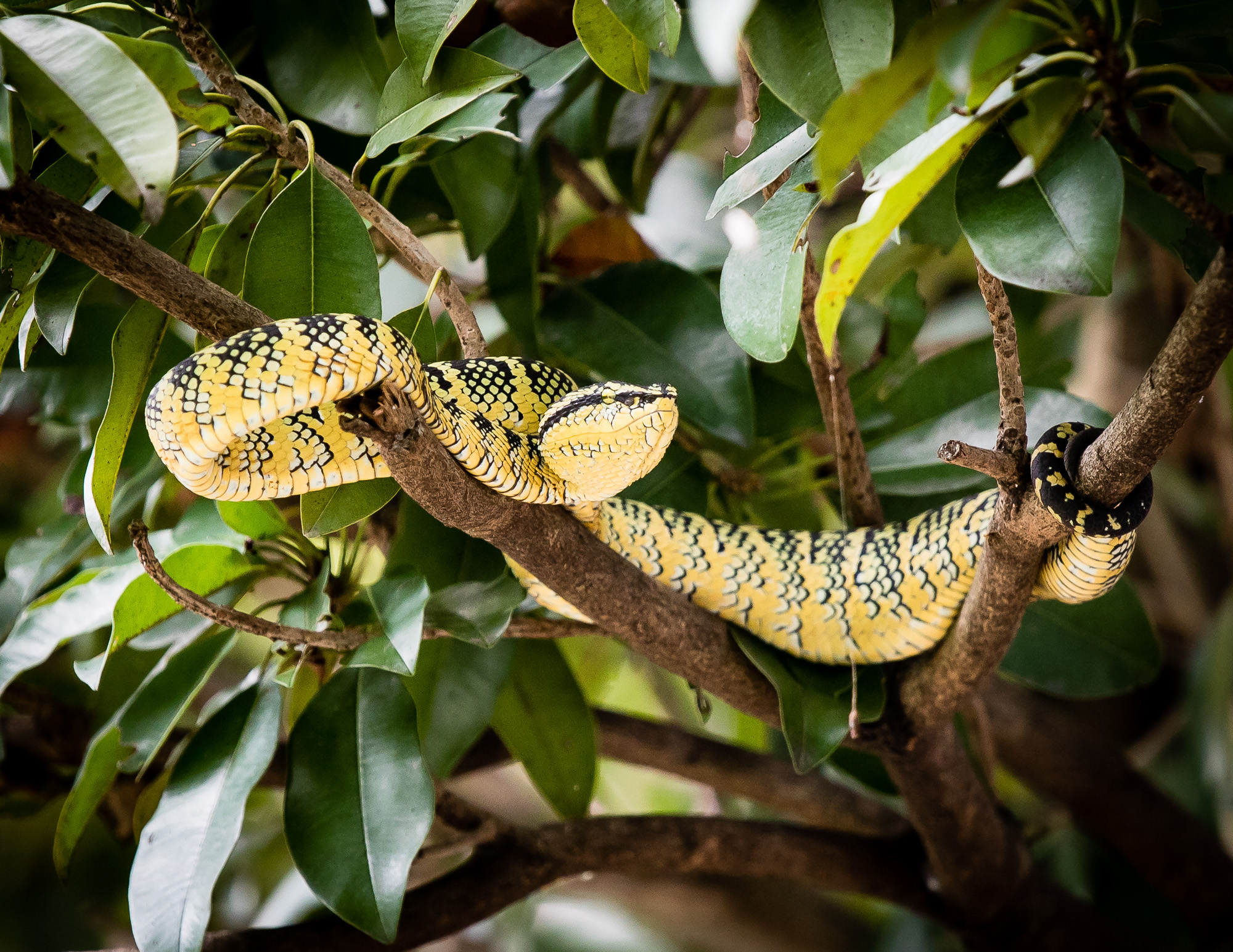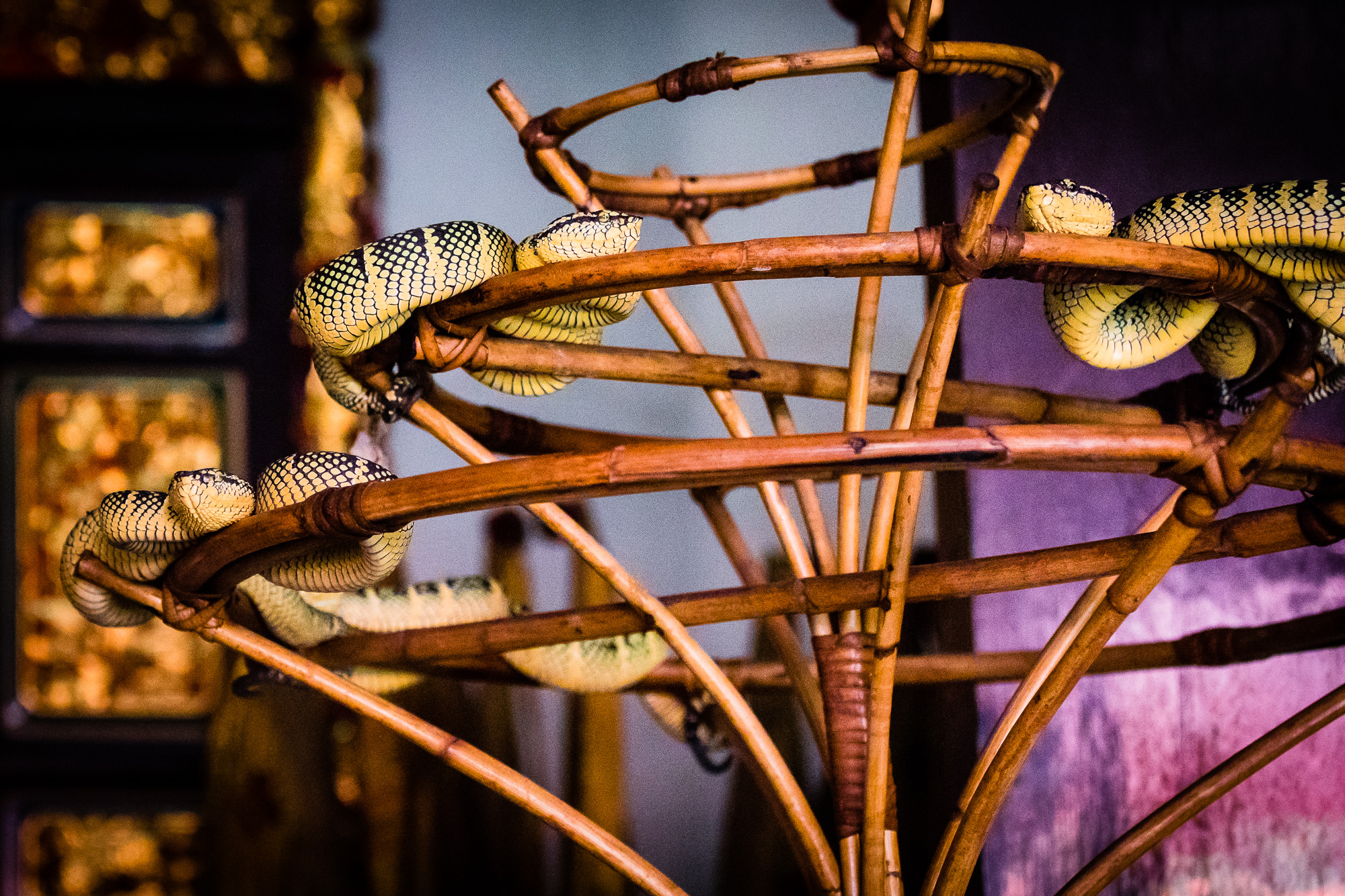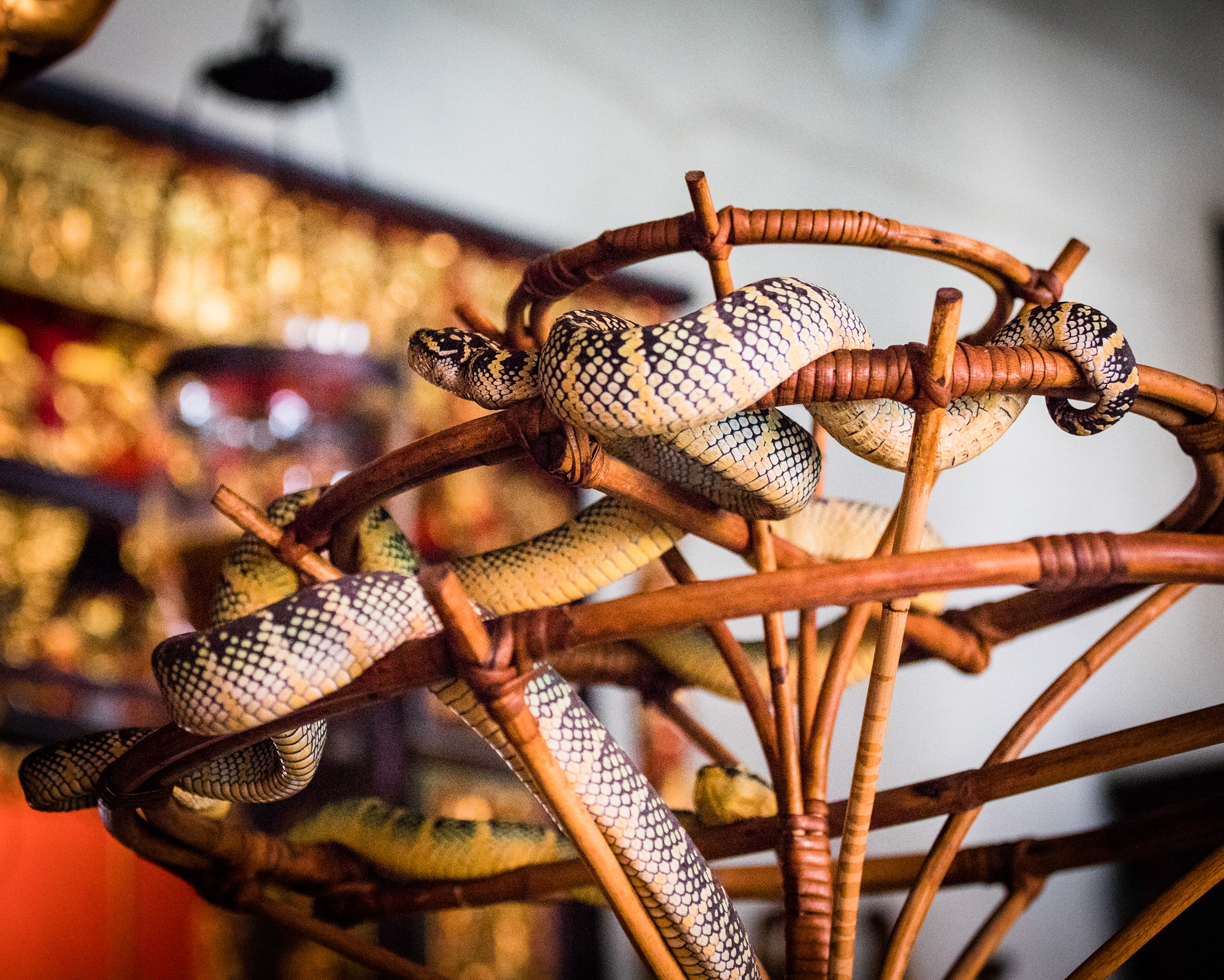 The snake temple of Penang is situated in the south west of the island and was built about 1850 by a Buddhist monk. After the construction of the temple, snakes reportedly appeared by themselves. The temple is filled with the smoke of burning incense and a variety of pit vipers. The snakes are believed to be rendered harmless by the sacred smoke, but as a safety precaution, the they are reported to have also been de-venomed but still have their fangs intact. Visitors are warned against picking up the reptiles and placing them on their bodies to take pictures. While some warnings seem over cautious this one was easy for me to follow.