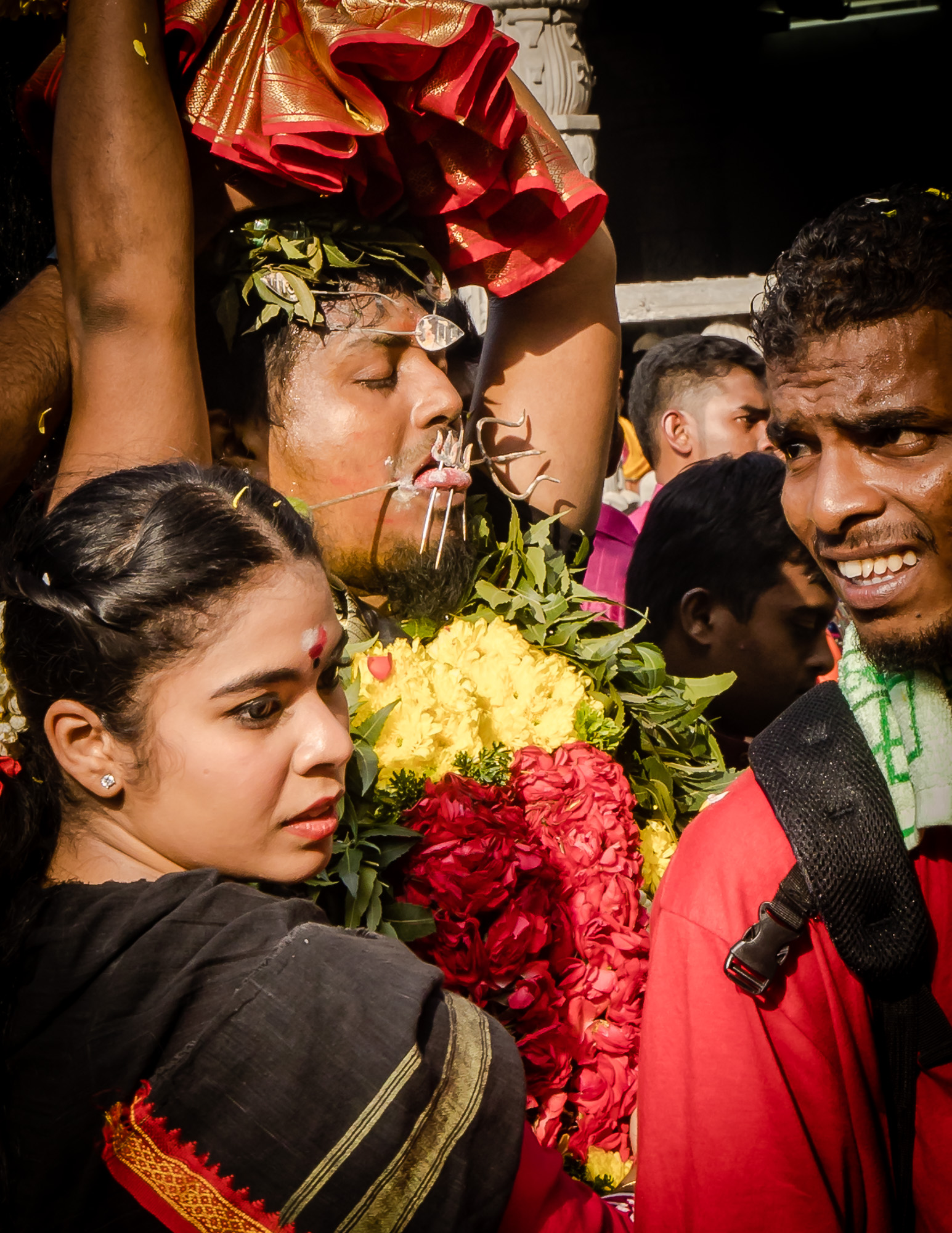 The devotees who go to these extremes say they don’t feel any pain because they are in a spiritual and devotional trance which brings them closer to Lord Murugan. The trance can be induced by chanting, drumming and incense.