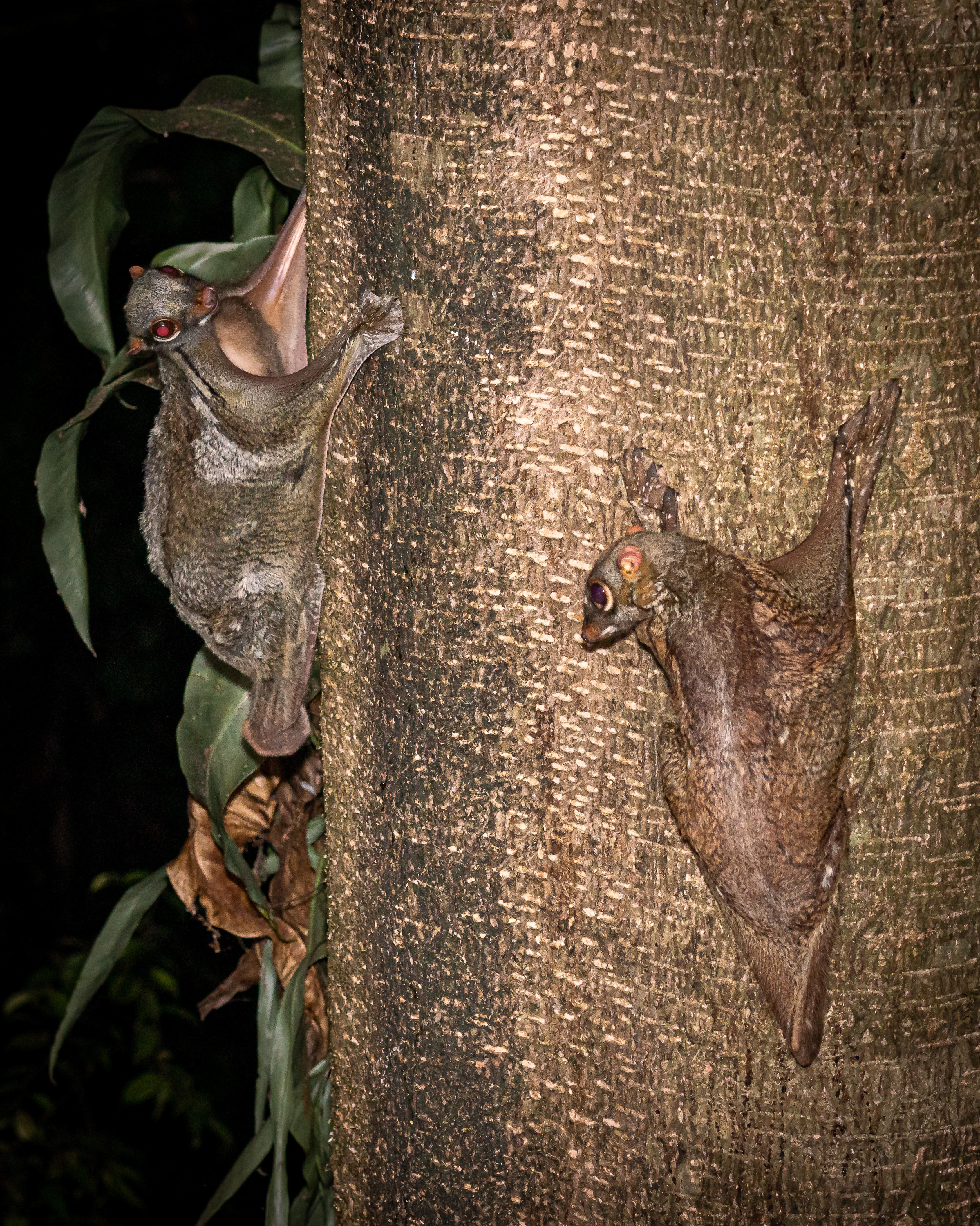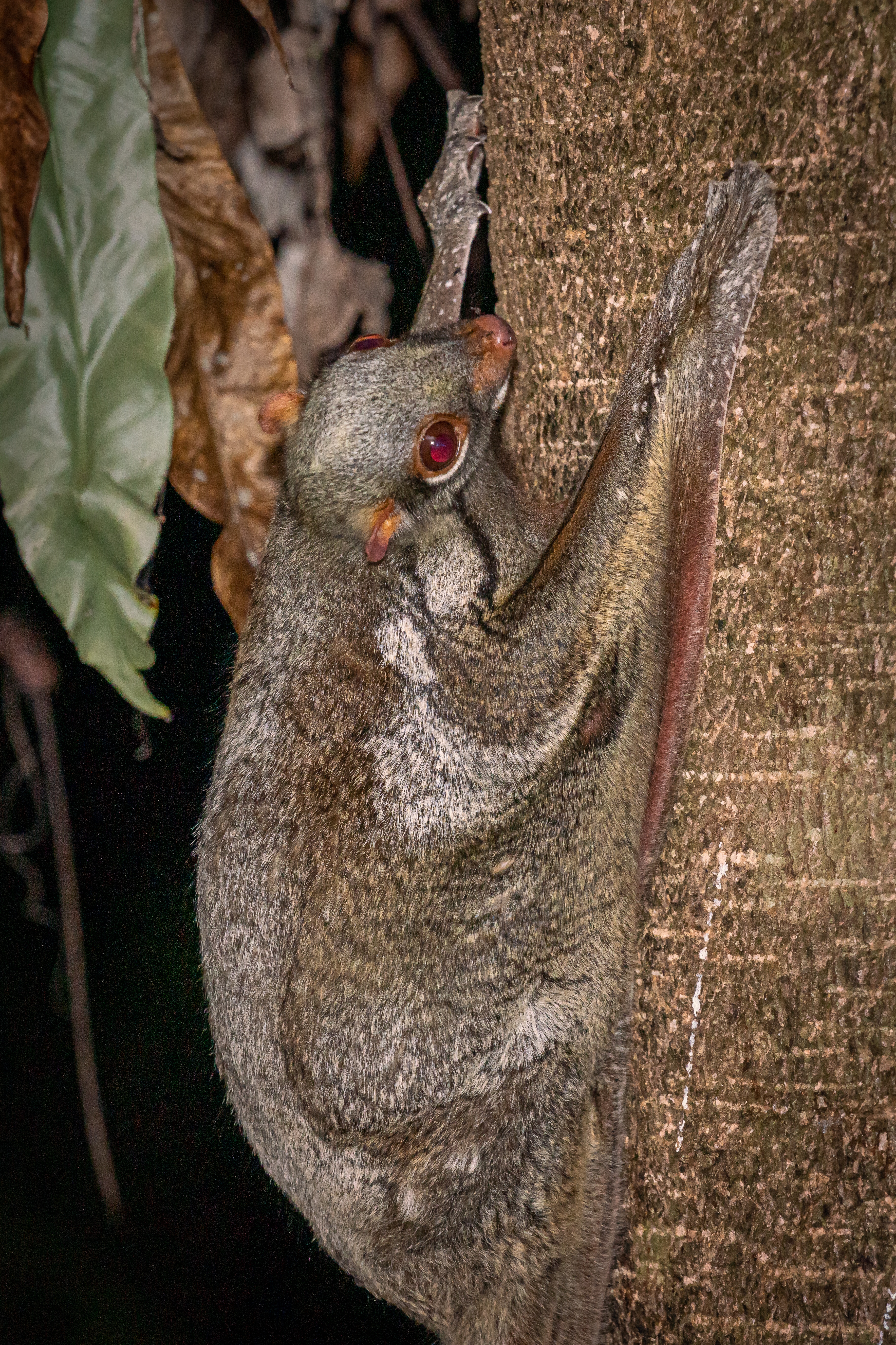 Sunda flying lemurs are not lemurs and they cannot fly. They are related to monkeys, and glide between trees in tropical forests in S E Asia. They can glide more than 100 m with minimal loss in elevation. When threatened, they either climb higher up or remain motionless. These animals are quite helpless if on the forest floor.They live either solitary or in small groups that are loosely connected. They can be territorial in foraging and sleeping areas. They are mainly nocturnal and are strictly arboreal and in the daytime, they sleep high within dense foliage in the treetops or in holes in trees. With all four of their feet, they cling on to the trunk of a tree or the underside of branches. Climbing involves stretching out their two front legs and then bringing up their two back legs, which results in an awkward hopping.